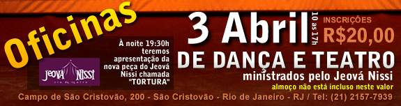 No dia 3 de Abril (sábado) teremos oficinas de dança e teatro ministrados pelo Jeová Nissi das 10 às 17h, com intervalo das 12:30h às 14h para almoço.